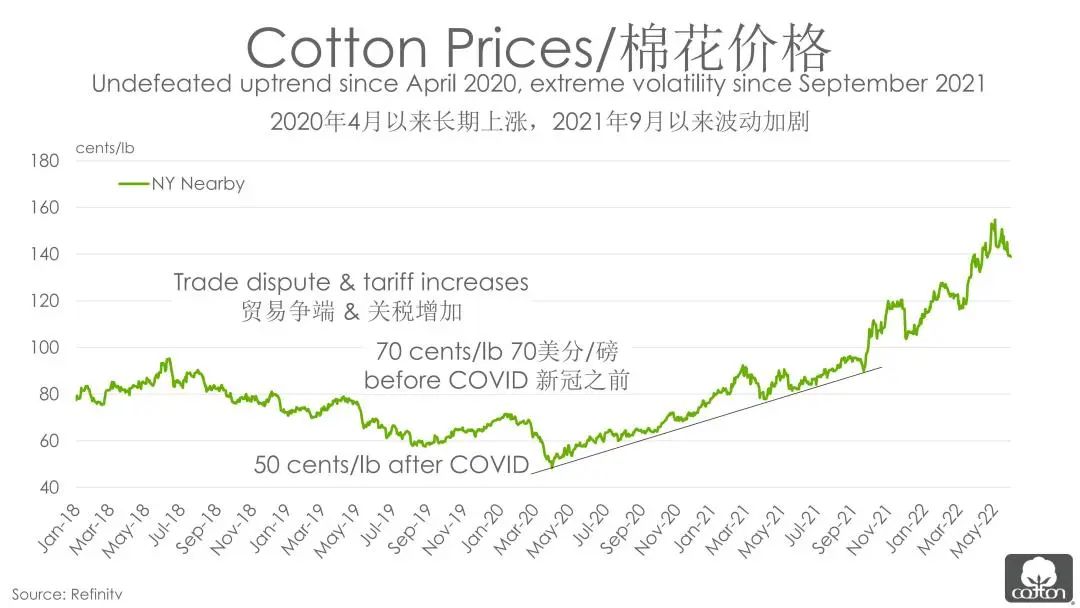 “在新冠之前,贸易纠纷一直在扰动着整个行业。”傅培花介绍道,美国是最大的棉花出口国与服装进口国,中国则是最大的棉花进口国与服装出口国。中美两个国家之间关税的互增以及贸易争端升级,给棉花市场带来了非常大的不确定性,并在几年内抑制了整个市场的发展。中美贸易争端期间,棉花价格呈下跌态势。随着谈判的进展以及第一阶段协议的签署,棉花市场在2019年末和2020年初出现了一些复苏迹象,棉价上涨至约70美分/磅。但随着新冠疫情的爆发,棉价下降到接近50美分/磅的水平。